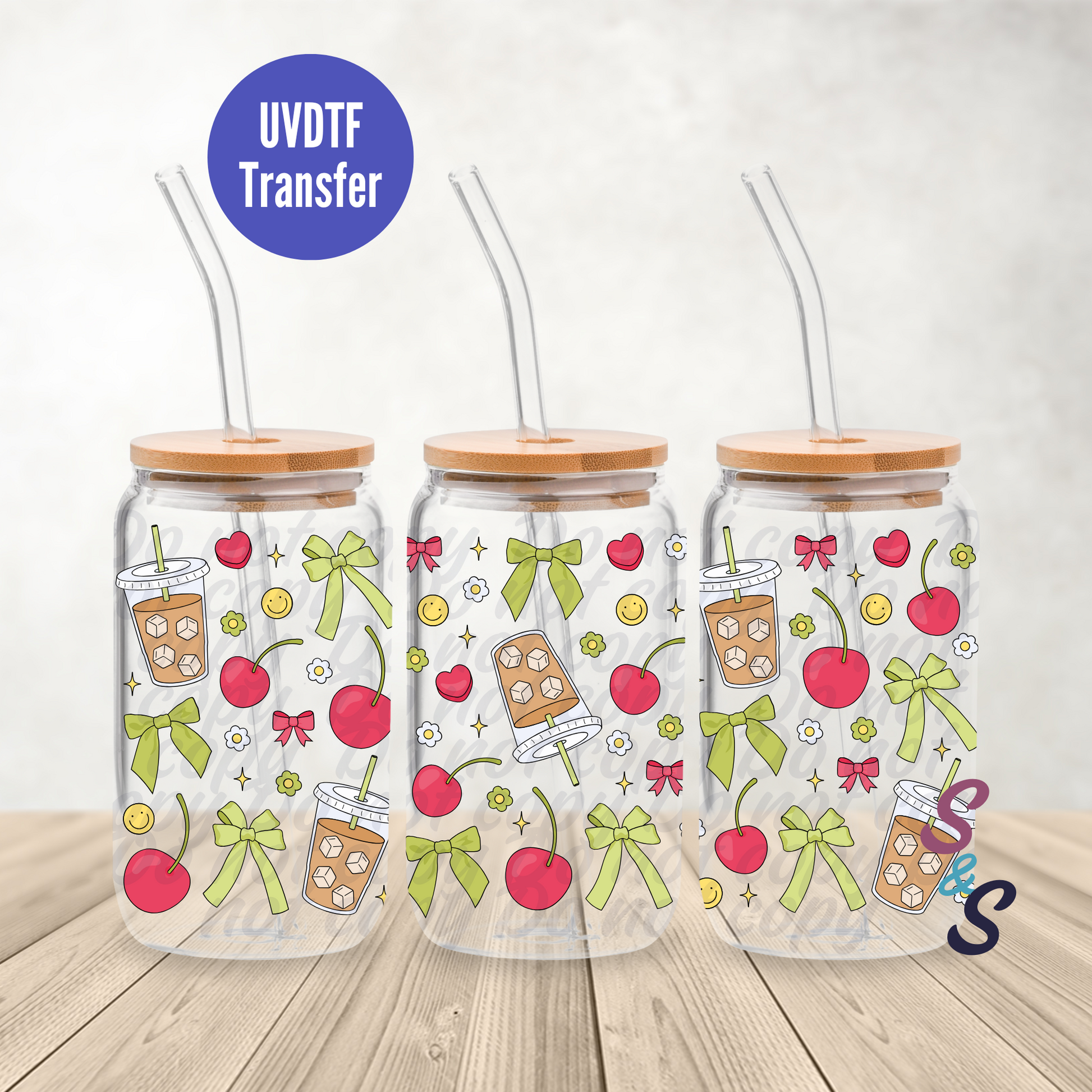 Iced Coffee & Cherries UVDTF Transfer 16 Oz Glass Can Wrap B110B