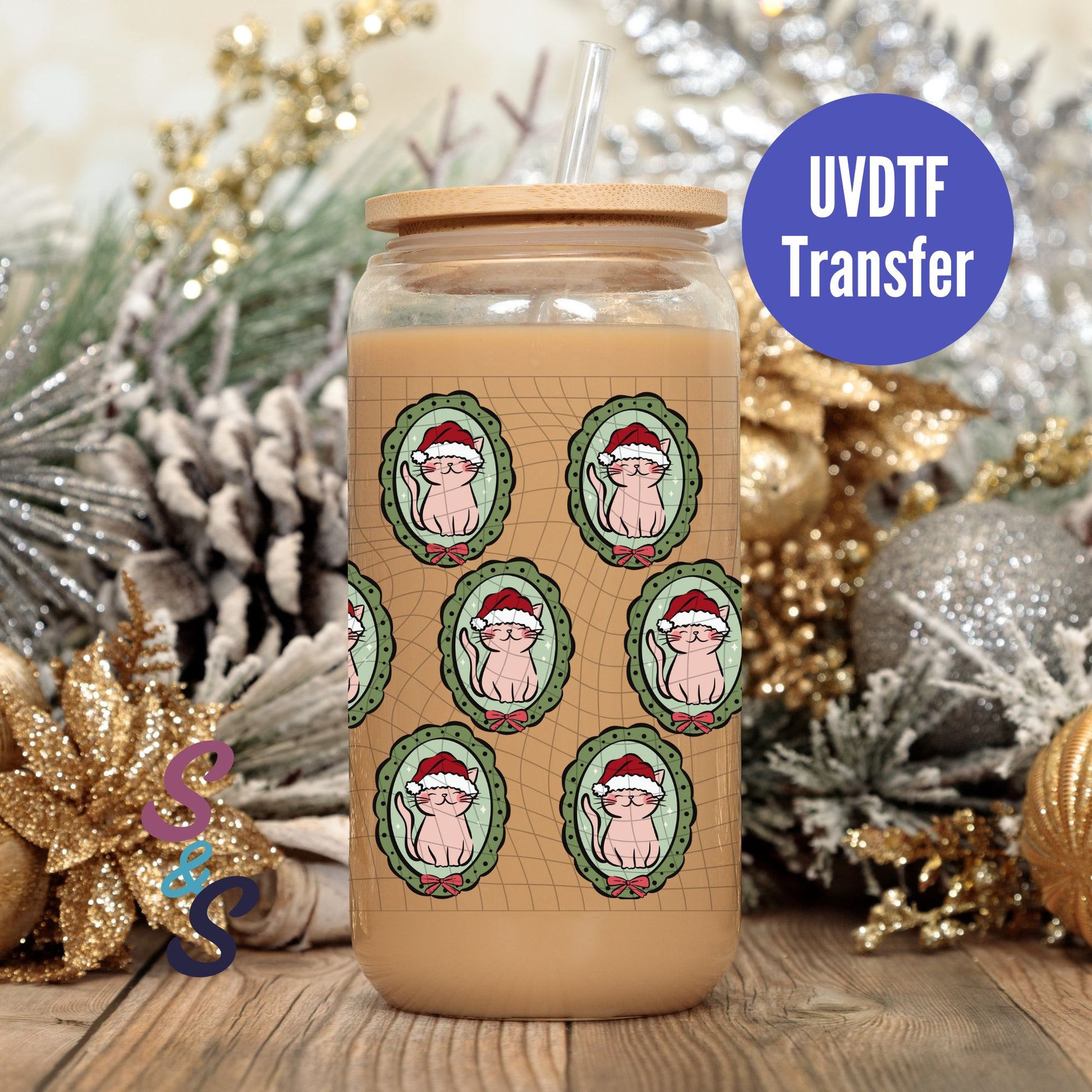 Santa Cat Frames UVDTF Transfer 16 Oz Glass Can Wrap